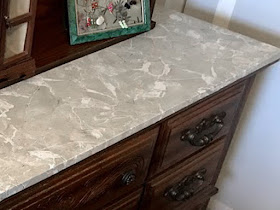 The dressers in our master bedroom posed somewhat of a dilemma. They were old but not antique ...the wood finish was in good shape, except for the tops...and nobody ever saw them but us! We could afford a new set but the frugal little gnome that sits continually on my shoulder whispered, "They're perfectly good so why spend the money on new ones?!"